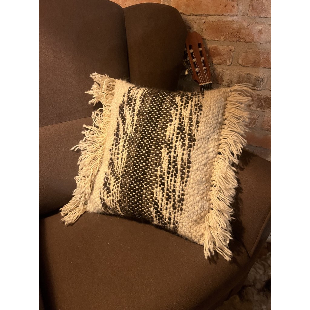 Polštář je tkaný z ručně předené vlny z lamy alpaky, osnova je ovčí vlna, výplň je ručně česaná ovčí vlna. Rozměr cca 50 x 50 cm